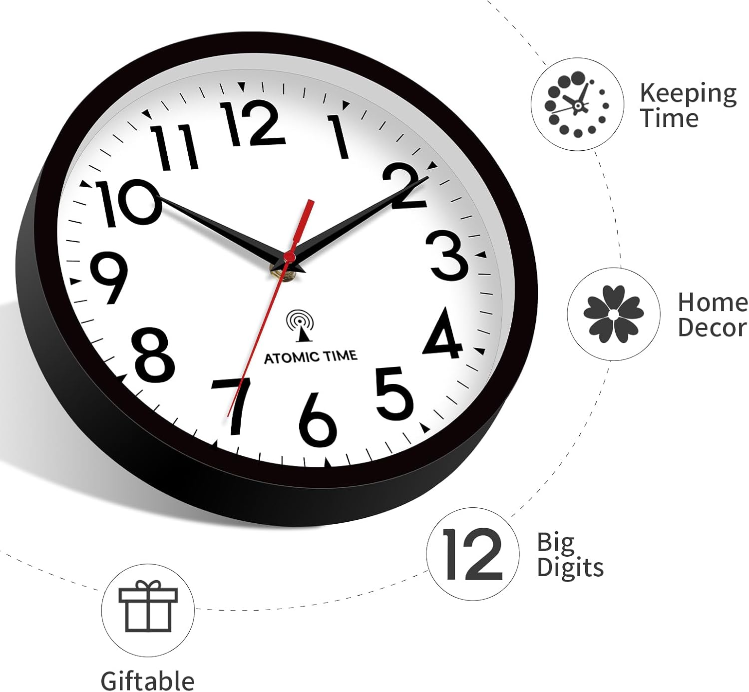 Atomic Wall Clock Analog 10 Inch Battery Operated Modern Decorative for Living Room Kitchen Office Bedroom Bathroom(Black)