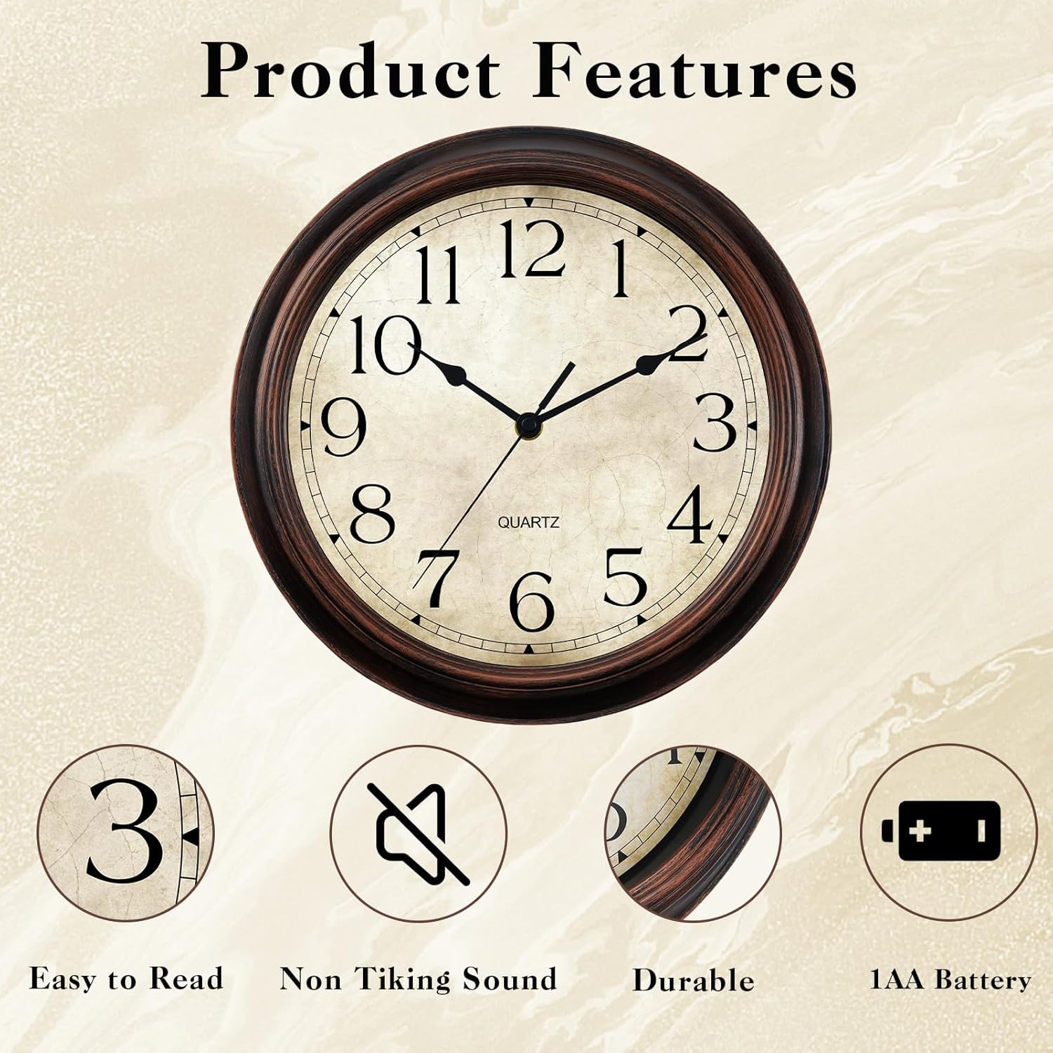 14 Inch Wall Clocks Battery Operated Silent Non-Ticking Analog Wall Clock Vintage Retro Rustic Style Decorative for Living Room Kitchen Home Office(Bronze)