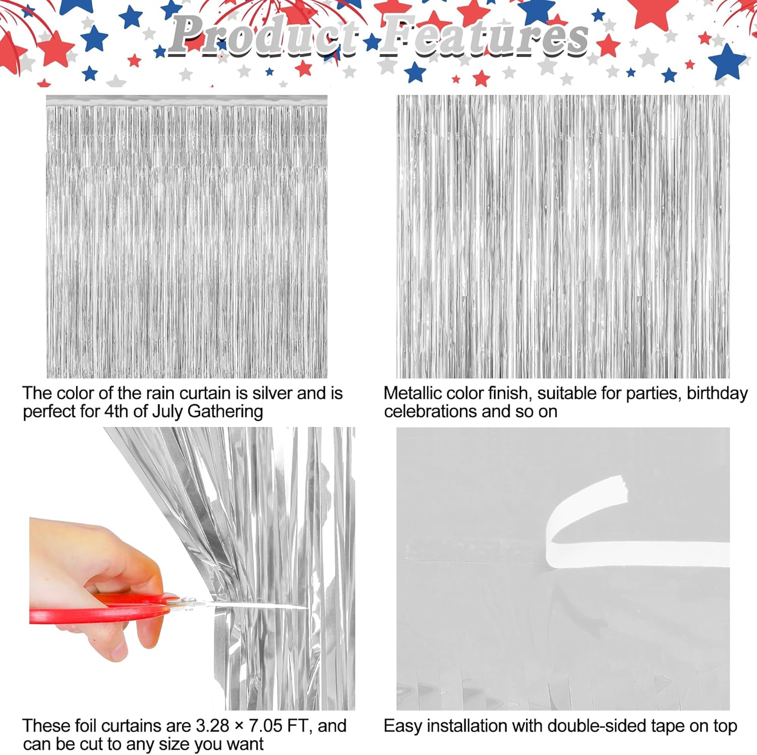 - Use Occasions: Suitable for a variety of celebrations including Independence Day, parties, birthdays, and other festive events, the silver tinsel backdrop is suitable for adding a glamorous touch to any occasion.