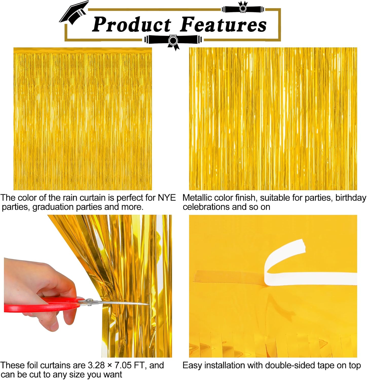 - Package Includes: This set contains 4 pack gold fringe backdrop, each measuring 3.28 FT x 7.05 FT, oversized design allows free cutting according to your needs.