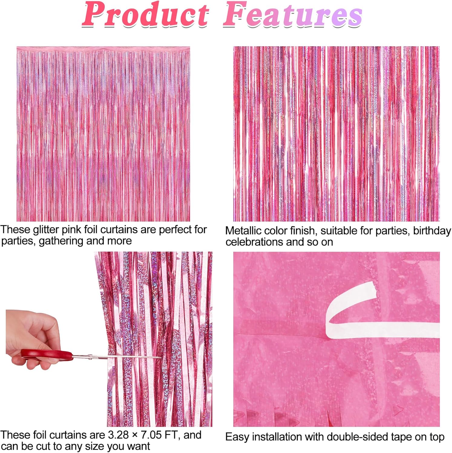 - Glitter Design: Each fringe curtain displays a unique glitter pink color with a laser-reflective metallic finish, adding a glittery visual effect to your pink birthday decorations.