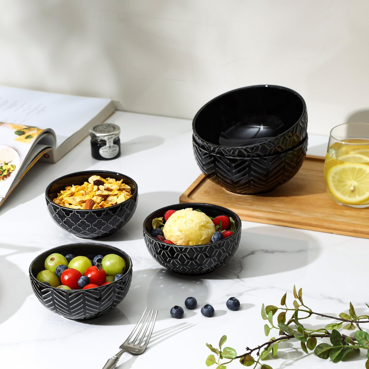 Sureasy Ceramic Ice Cream Bowls, 12oz Embossed Dessert Bowls Set, 4.6 Inch Stoneware Small Bowls for Snack, Sauce, Fruits, Microwave and Dishwasher Safe, Set of 4, Black