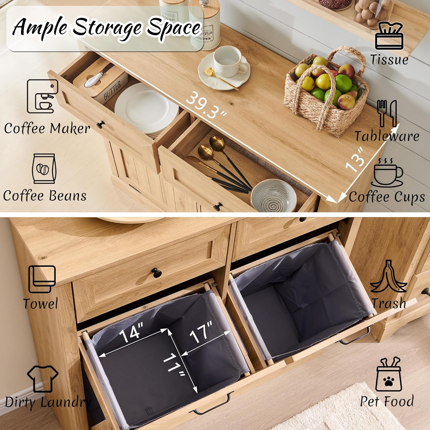 - 【Double Tilt Out Laundry Hamper】Cabinet Dimensions: 13"D x 39.3"W x 35.8"H. Drawer Dimensions: 9.84"D x 17"W x 6.53"H. This laundry hamper cabinet holds 2 x 10 gallon trash can. (Includes 2pcs laundry basket.)