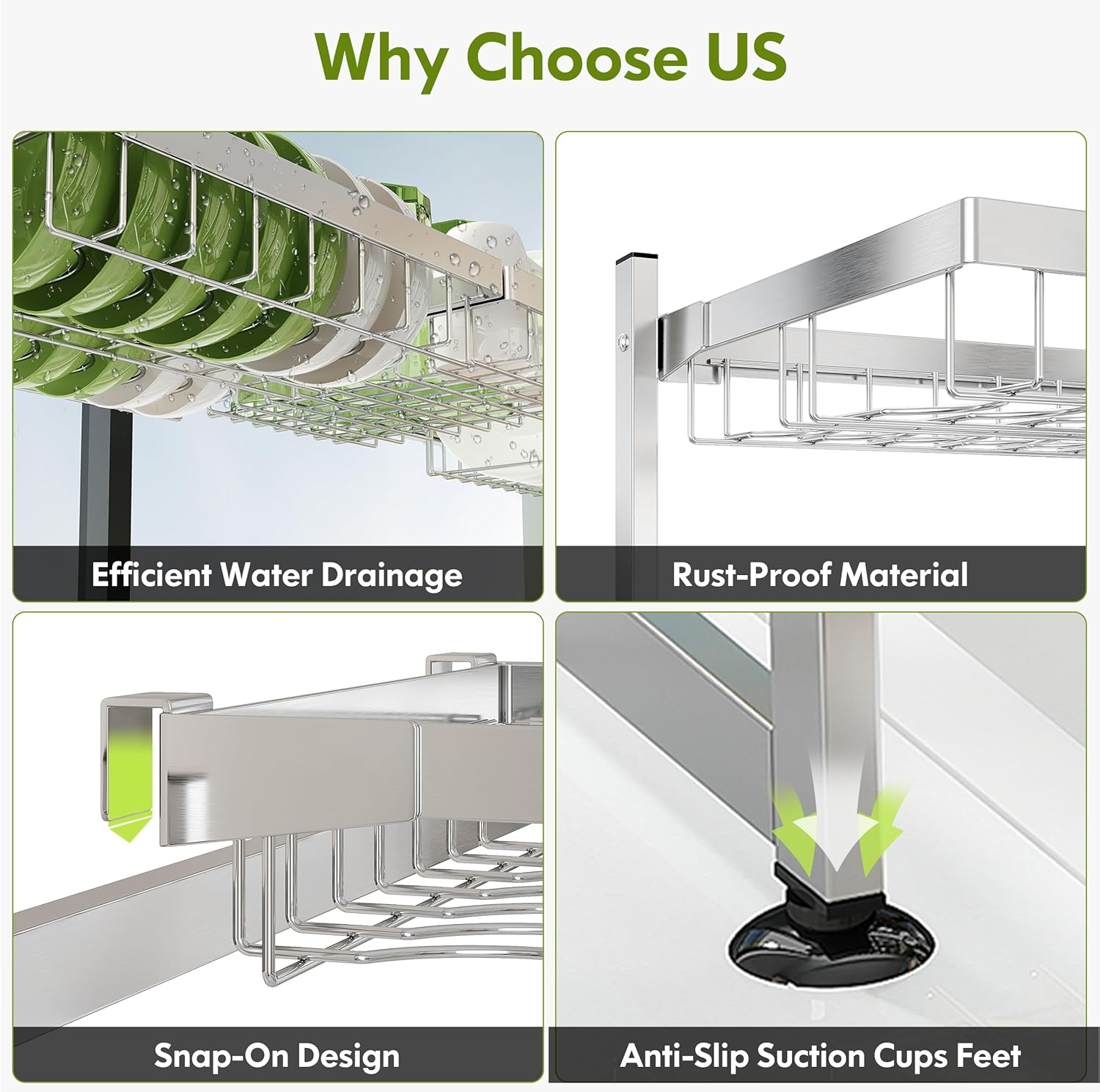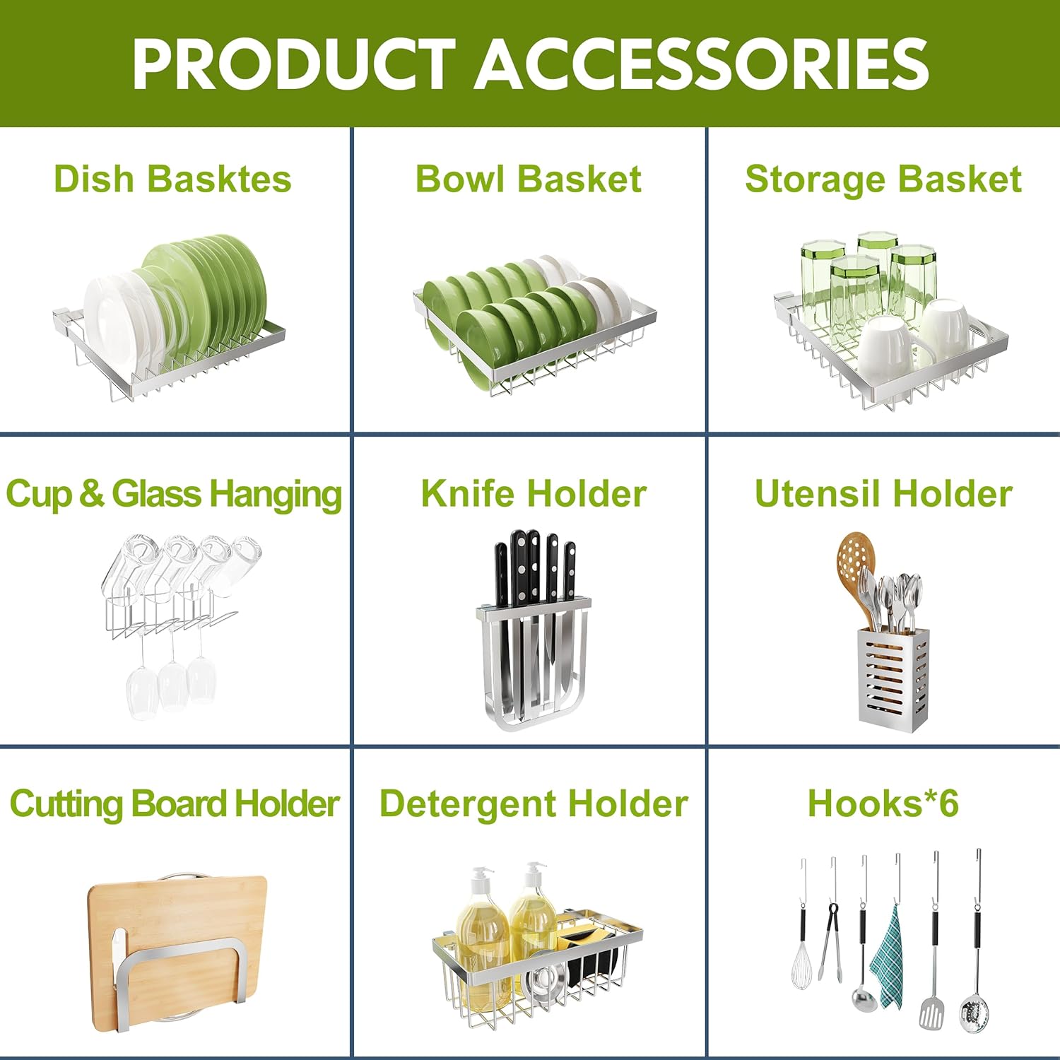 - 🧽 Hygienic & Easy Clean Grid Design: The seamless stainless steel surface prevents grime buildup, while the open grid metal dish drying rack structure allows quick wiping without disassembly. Removable accessories fit in sinks for deep cleaning, perfect for households prioritizing kitchen sanitation