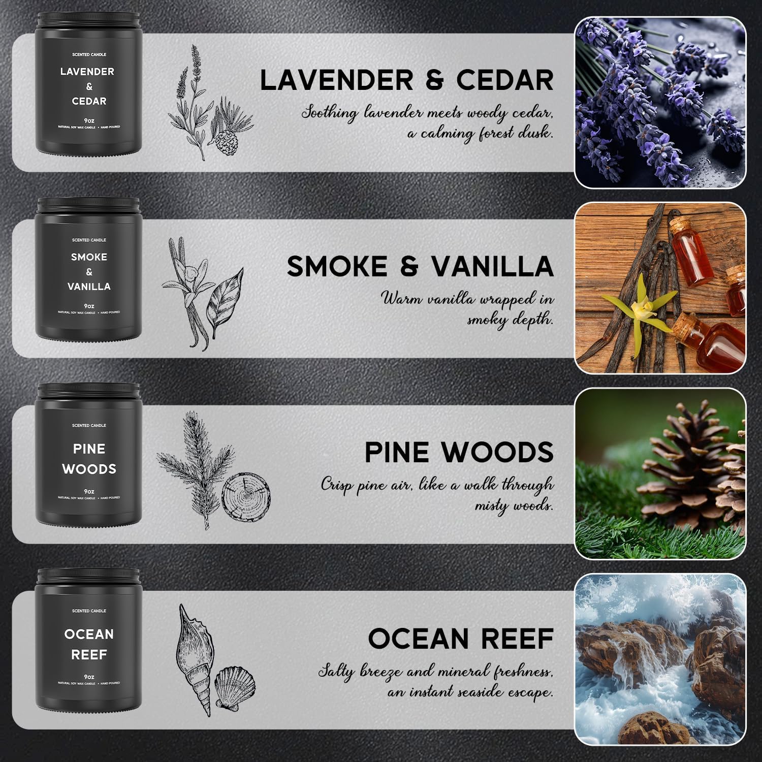 - 4 Scent of Pack:Lavender&Cedar Combining the soothing fragrance of lavender with the grounding notes of cedarwood. Smoke & VANILLA Combining the smoky whisper of burning embers with the sweet. PINE WOODS Combining the crisp, resinous freshness of pine needles with the earthy depth of aged timber. OCEAN REEF Combining the salty, mineral tang of sea spray with the lush