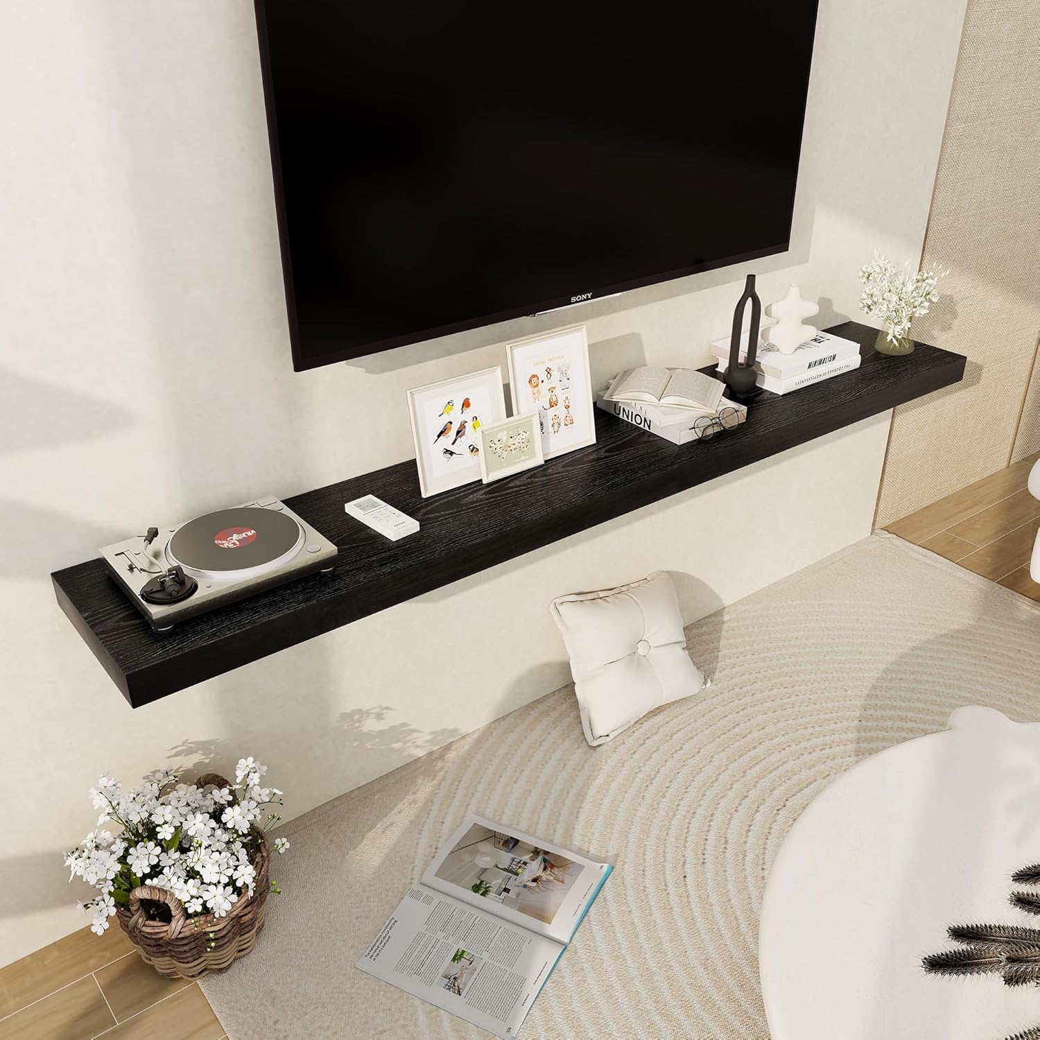 - 【DECORATIVE & FUNCTIONAL】The wall-mounted floating shelves are designed for decoration and storage, utilizing and decorating any space in your home. Used as shelf decor to show your collection, books, or prize, the hanging shelves are perfect for displaying your photo frame, small plants, model, or audio in your living room, office, study. And can also use as over the toilet storage shelf in the bathroom to hold toiletries or used as kitchen shelf to storage condiments.