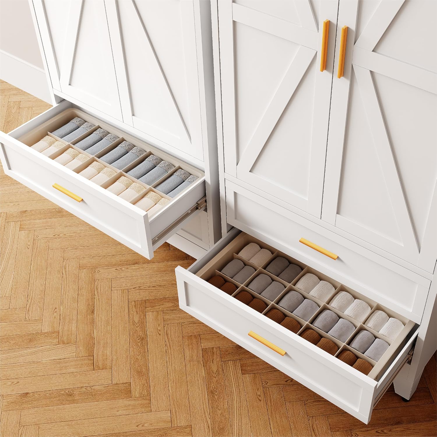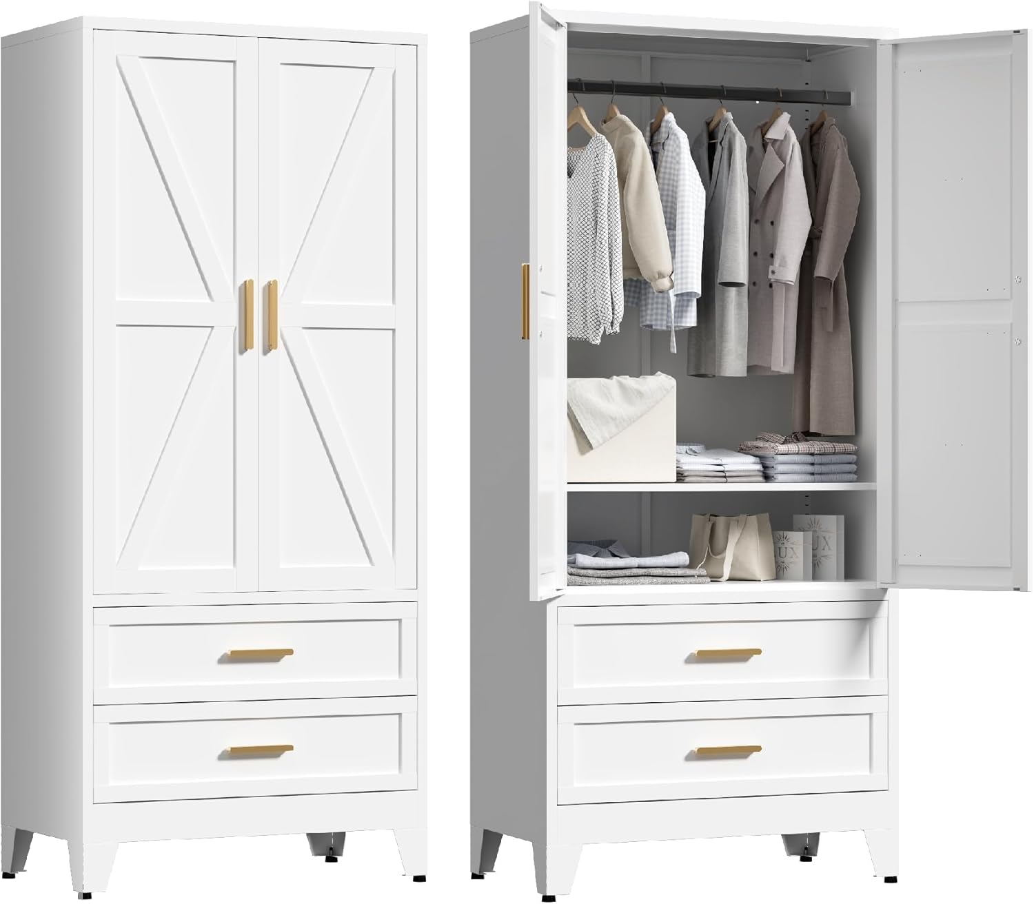 71'' Farmhouse Metal Wardrobe Cabinet with Hanging Rod, 2 Barn Door Wardrobe Closet with Adjustable Shelves,2 Drawer,for Dining Room,Bedroom,Living Room, Cloak Room,Office (White)