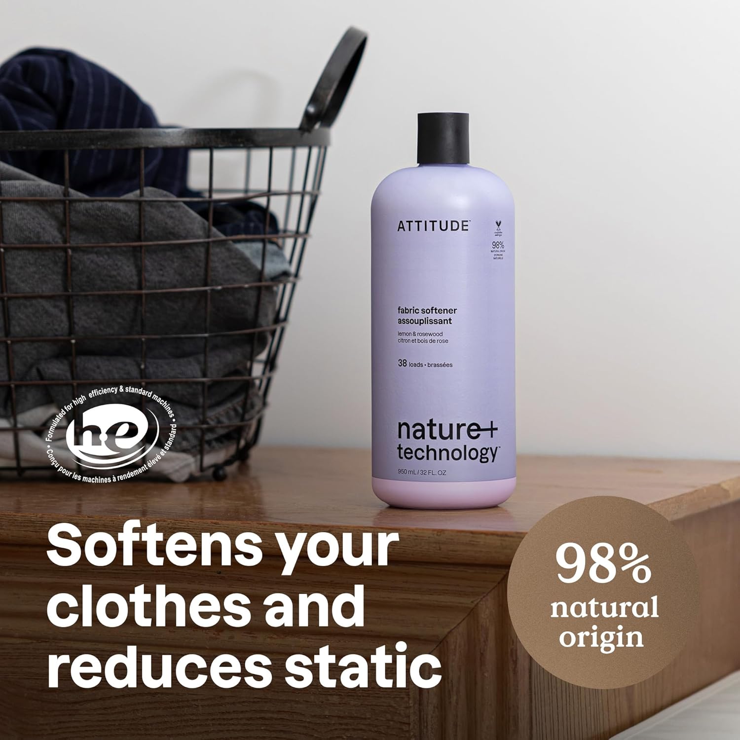 ATTITUDE Liquid Fabric Softener, Natural Origin Ingredients, For White and Colored Clothing, Deodorizes, Gentle on Delicate Skin, Lemon & Rosewood, 38 Loads, 32 Fl Oz