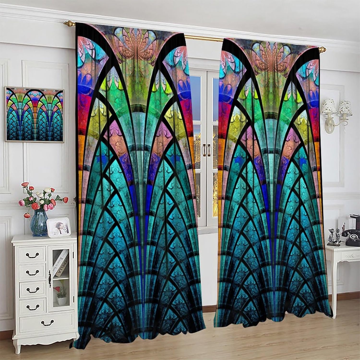 Stained Glass Curtains,Retro Design Style Colorful Abstract Art Home Decor Drapes for Bedroom Living Room Kitchen Window Treatment 2 Panels Set Total Size 63" W X 63" L Inch