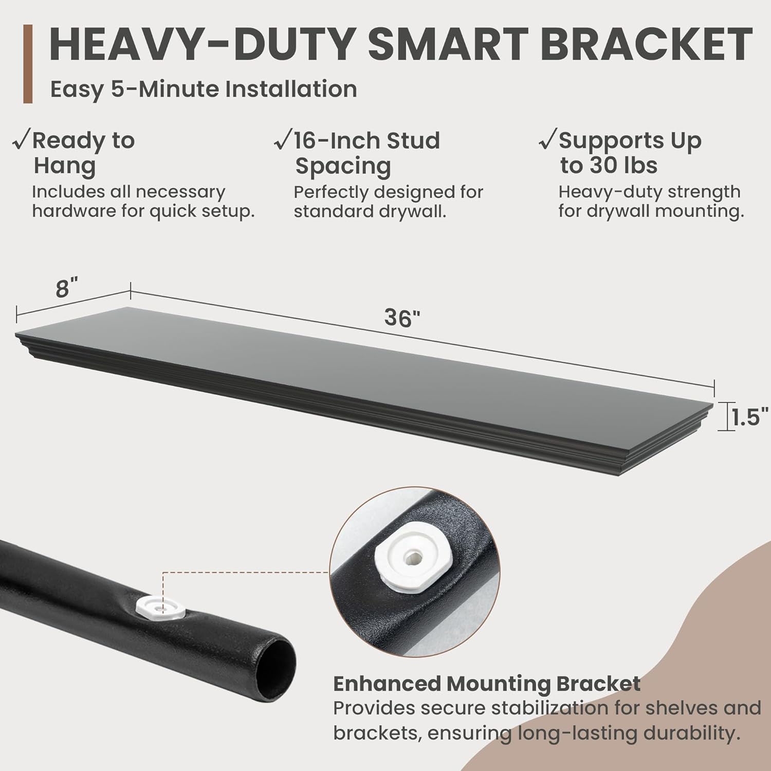 - Strong Suppoot: MDF wooden floating shelf with reinforced brackets supports heavy items effortlessly, holding up to 30 pounds. Hanging shelf's bracket has been preset with a 2° elevation to remain level and not sag after bearing heavy loads