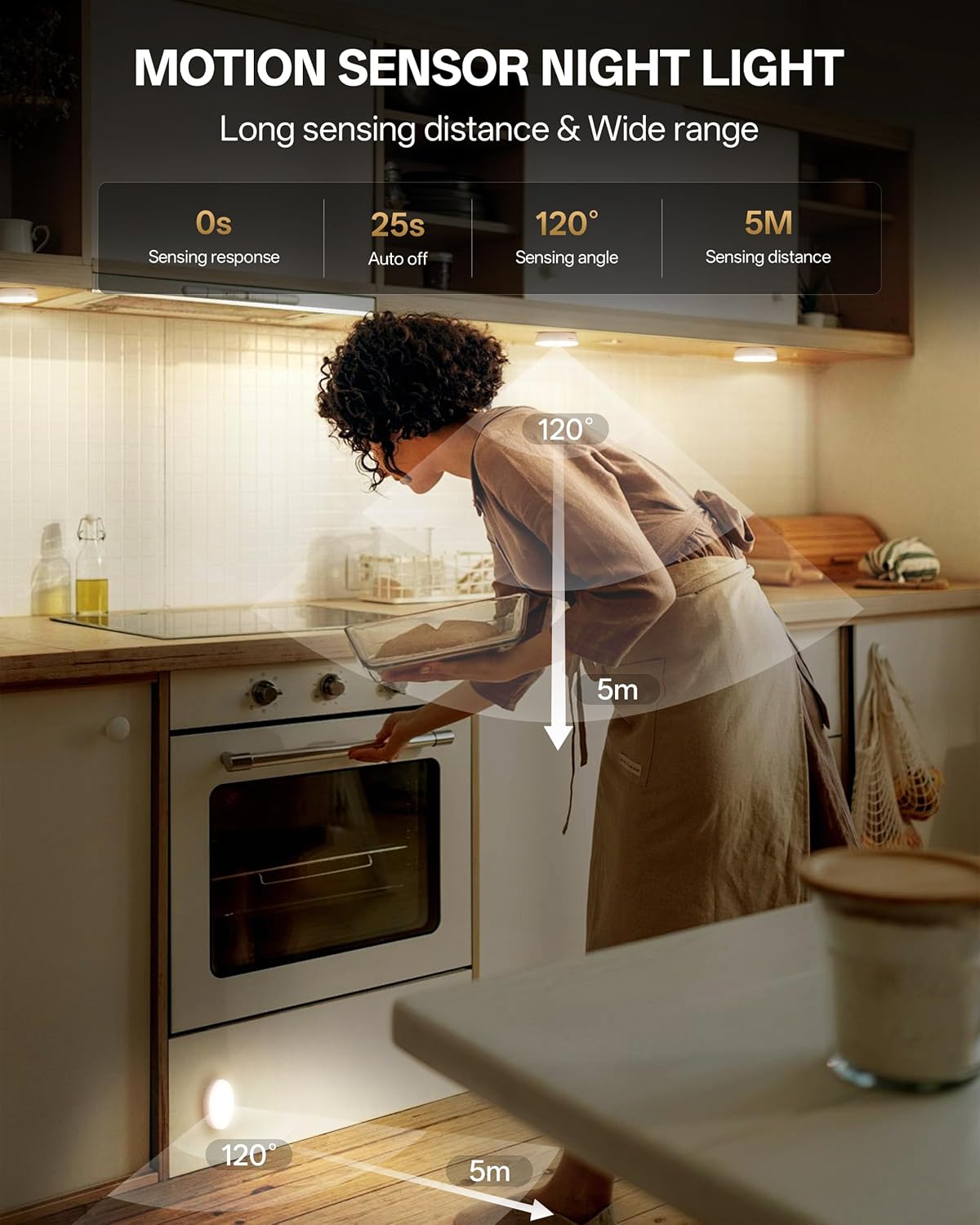 - 【 Motion Sensing & 3 Mode Operation】Industrial-grade 120° wide-angle sensor detects movement within 16ft (5m) radius. Customize illumination with: Smart Daylight Mode: Auto-adapts to ambient light - activates all day only when Lux <60. Night Auto Mode: under cabinet lighting wireless only activated in a dark enviroment. Tips: if no motion is detected in 20s after turning on, the motion sensor closet lights will turn off for energy conservation. Always-on Mode-press the "ON" button on remote control in AUTO mode