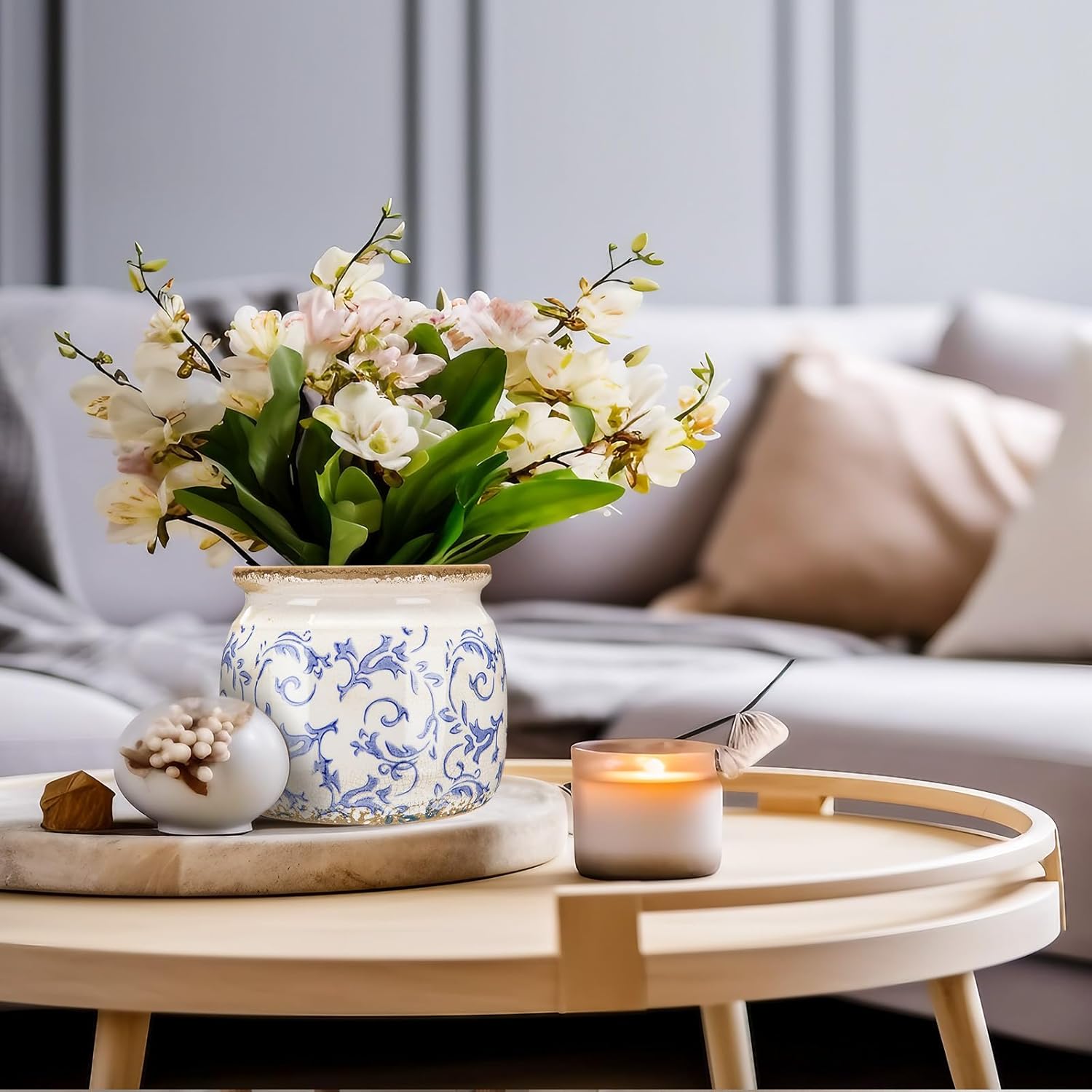1 Pcs Vintage Planter Large Ceramic Plants Pot Blue Chinoiserie Crack Cottage Scroll Vase Flower Vase Pot Indoor Plants Home Kitchen Decor Farmhouse Antique Decorative Gift