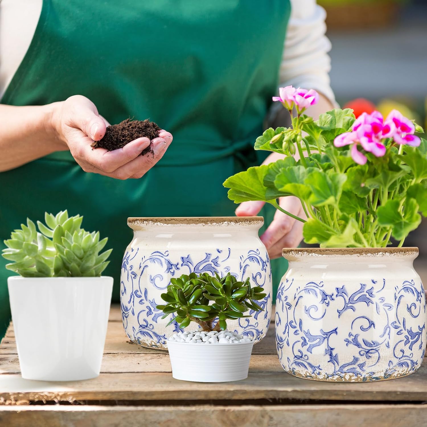 - Elegant Vintage Floral Design: this ceramic plant pot features a classic blue and white floral pattern with a vintage-inspired crackle glaze finish, offering timeless elegance; The detailed botanical pattern adds charm to any space, whether applied in a rustic home, modern office, or cozy indoor garden nook