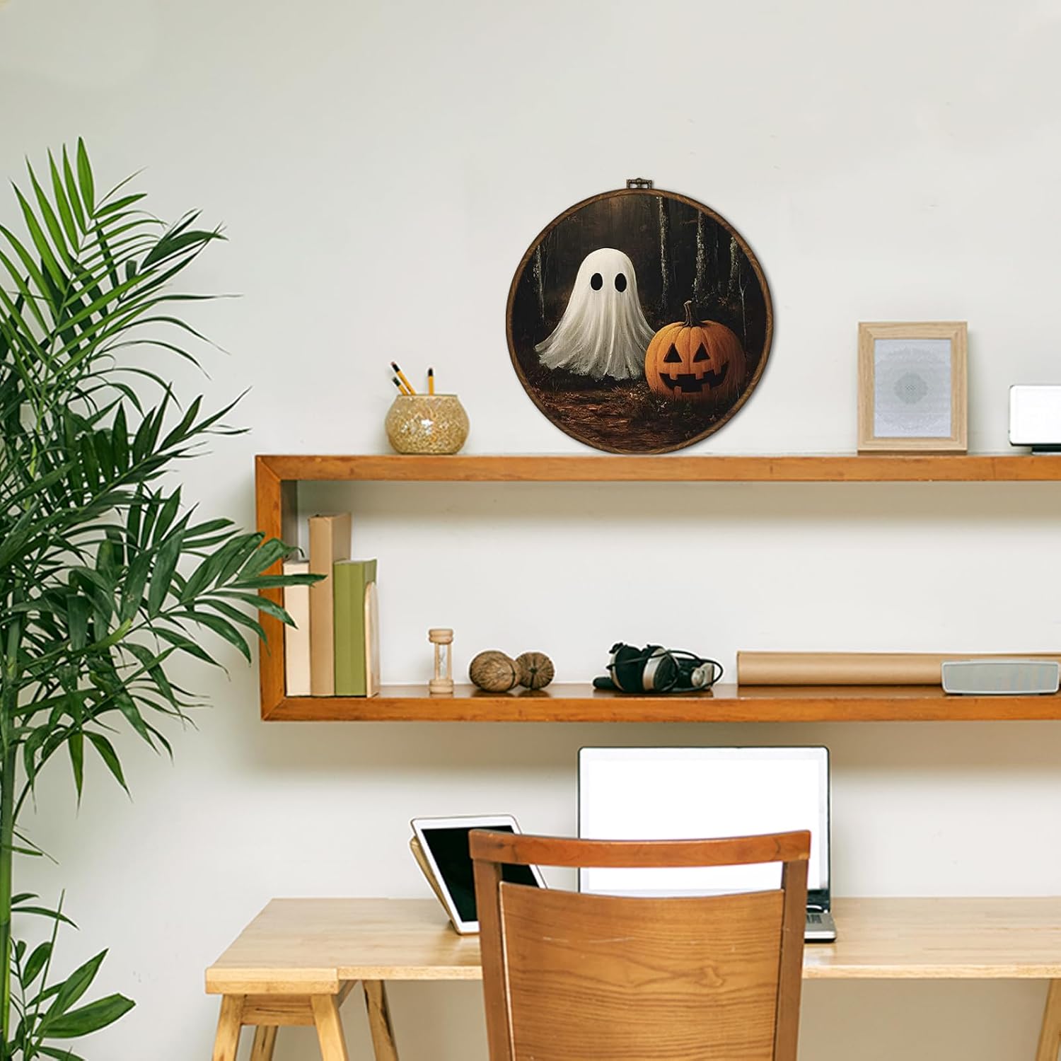 cvjutf Vintage Ghost Halloween Wall Art Framed, Ghost Bathroom Decor, Gothic Dark Academia Fall Round Wall Decor, Witchy Halloween Pumpkin Canvas Prints Art for Bedroom Bathroom Living Room, 10x10 In