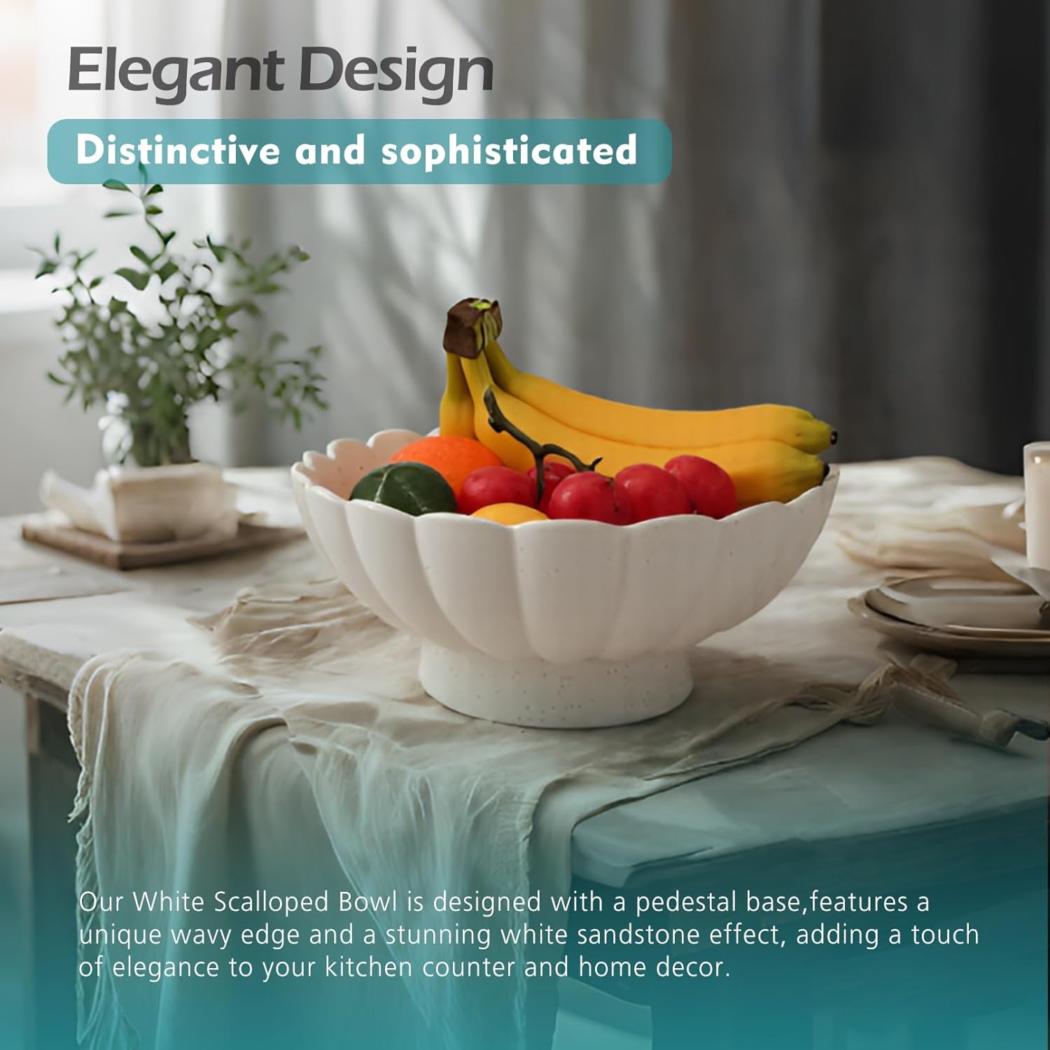 - Elegant Design: Our 10.6"-Inch White Scalloped Fluted Bowl is designed with a pedestal base,features a unique wavy edge and a stunning white sandstone effect, adding a touch of elegance to your kitchen counter and home decor. Perfect for serving fruits , serving salads or as a decorative centerpiece.