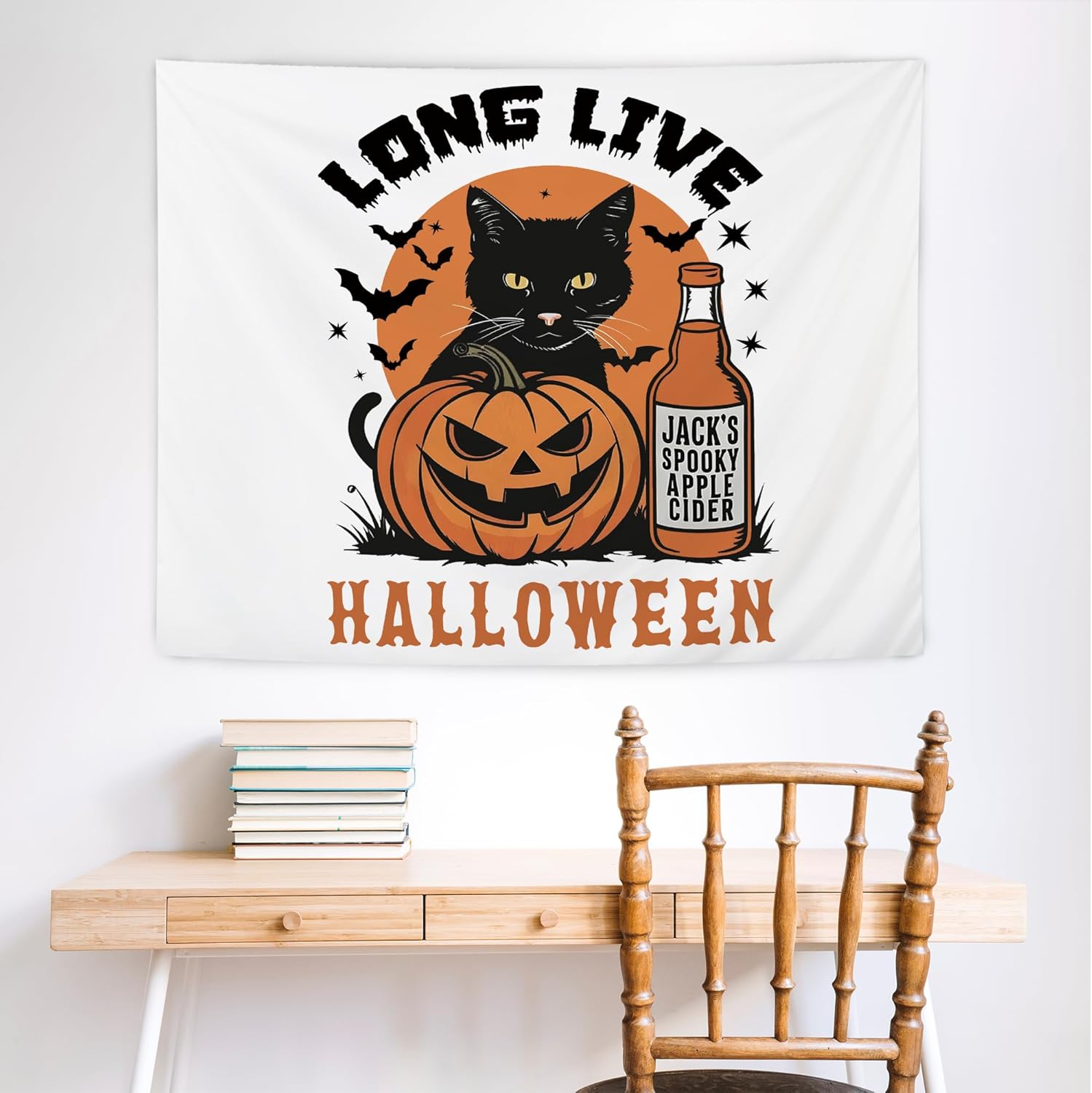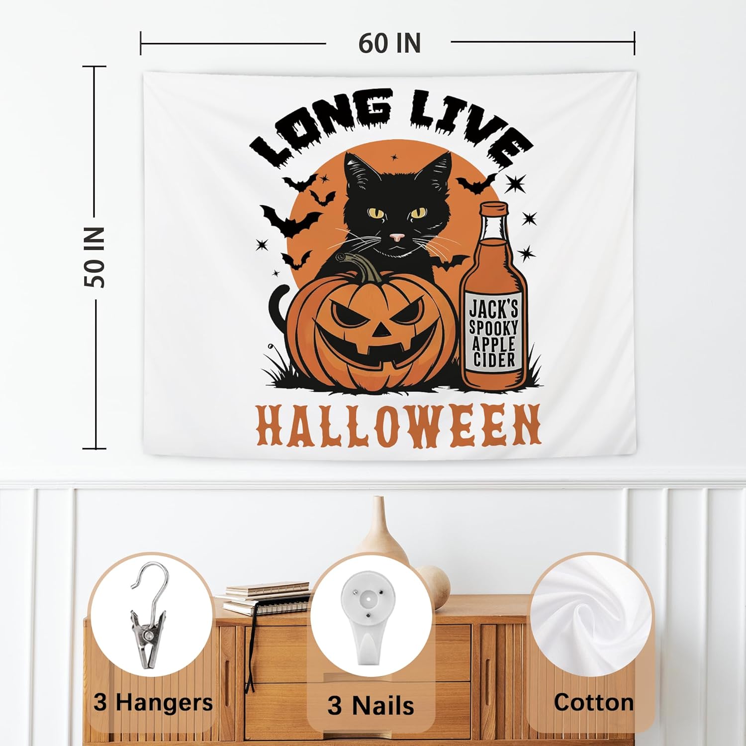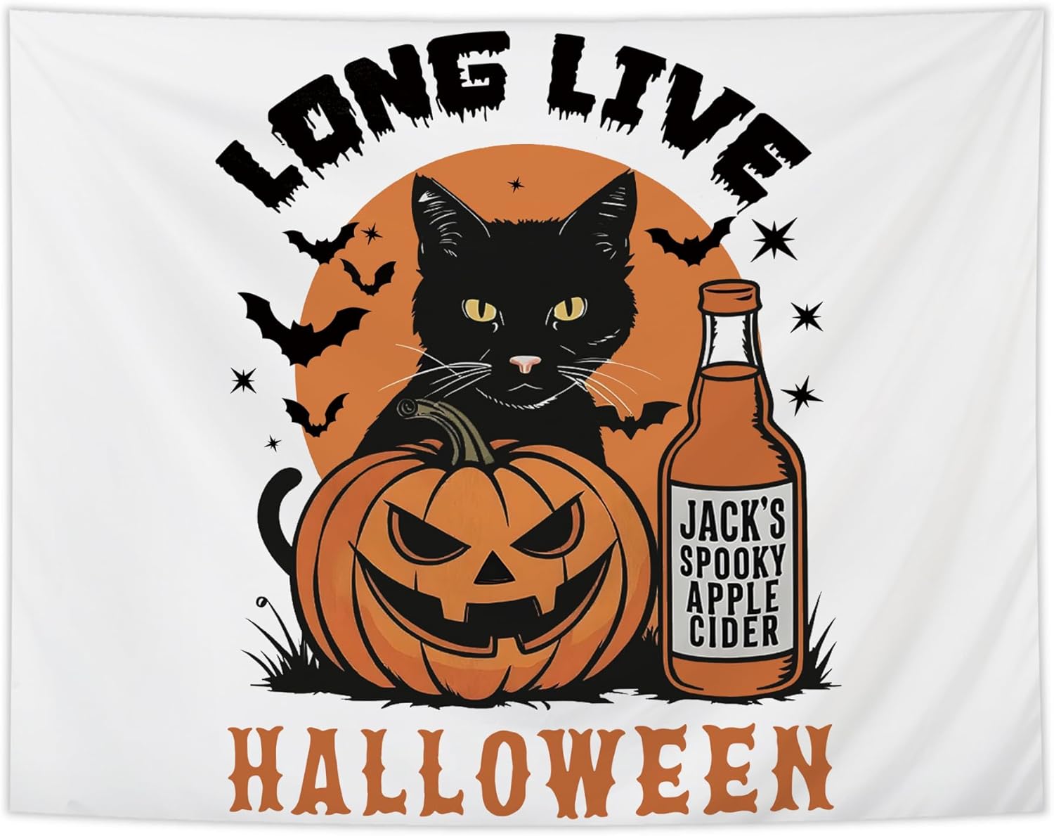 NATSUNO Halloween Tapestry, Long Live Halloween Wall Tapestry for Bedroom, Trendy Black Cat Pumpkin Apple Cider and Bats Tapestries Wall Hanging for Home Living Room Decor, 50x60 Inches