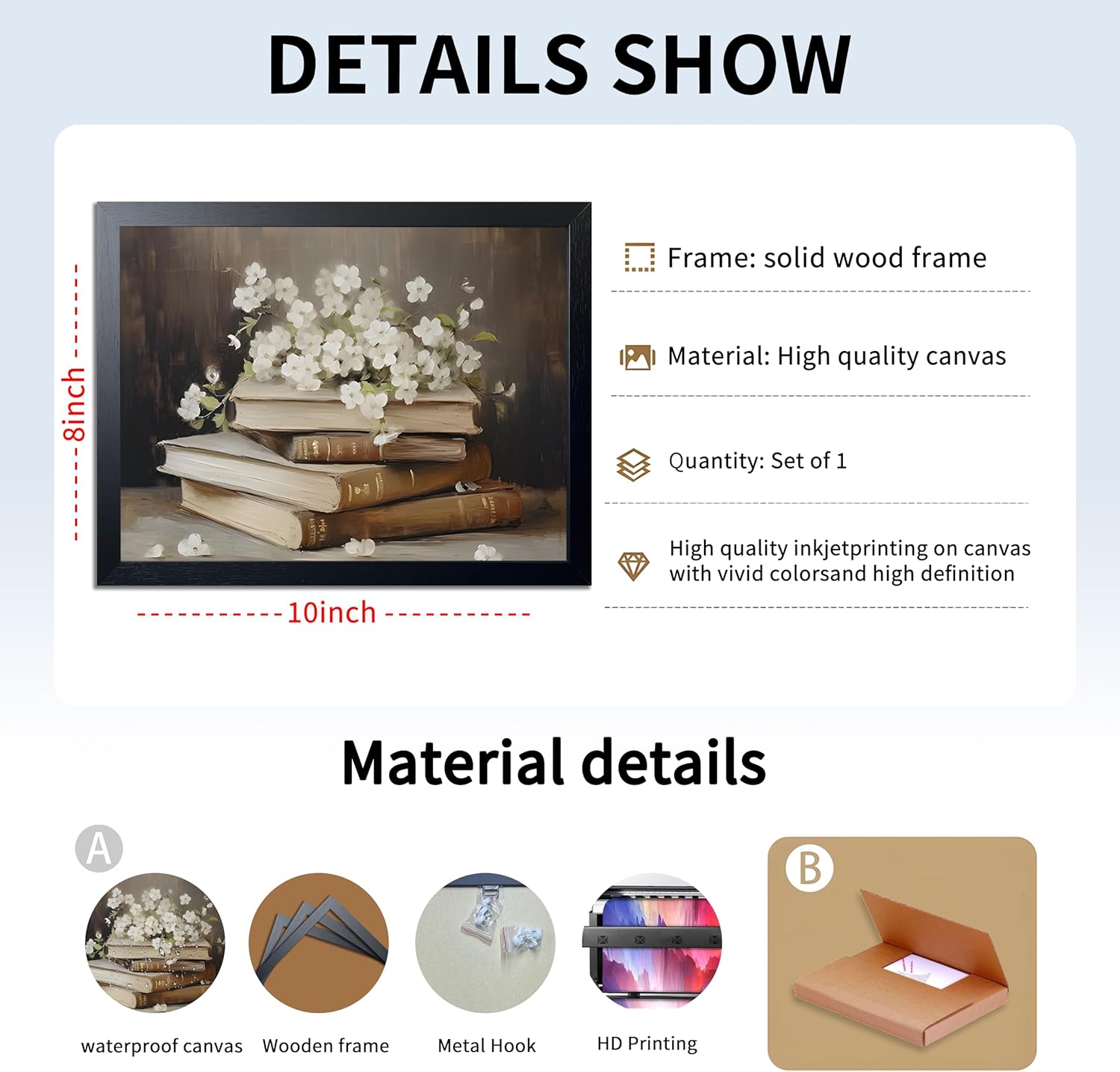 Wood Framed Canvas Poster Print Wall Art, Vintage Floral Book Wall Decor Oil Painting, Dark Academia Room Aesthetics Picture for Bathroom Classroom Dormitory room Decor 8x10 inch