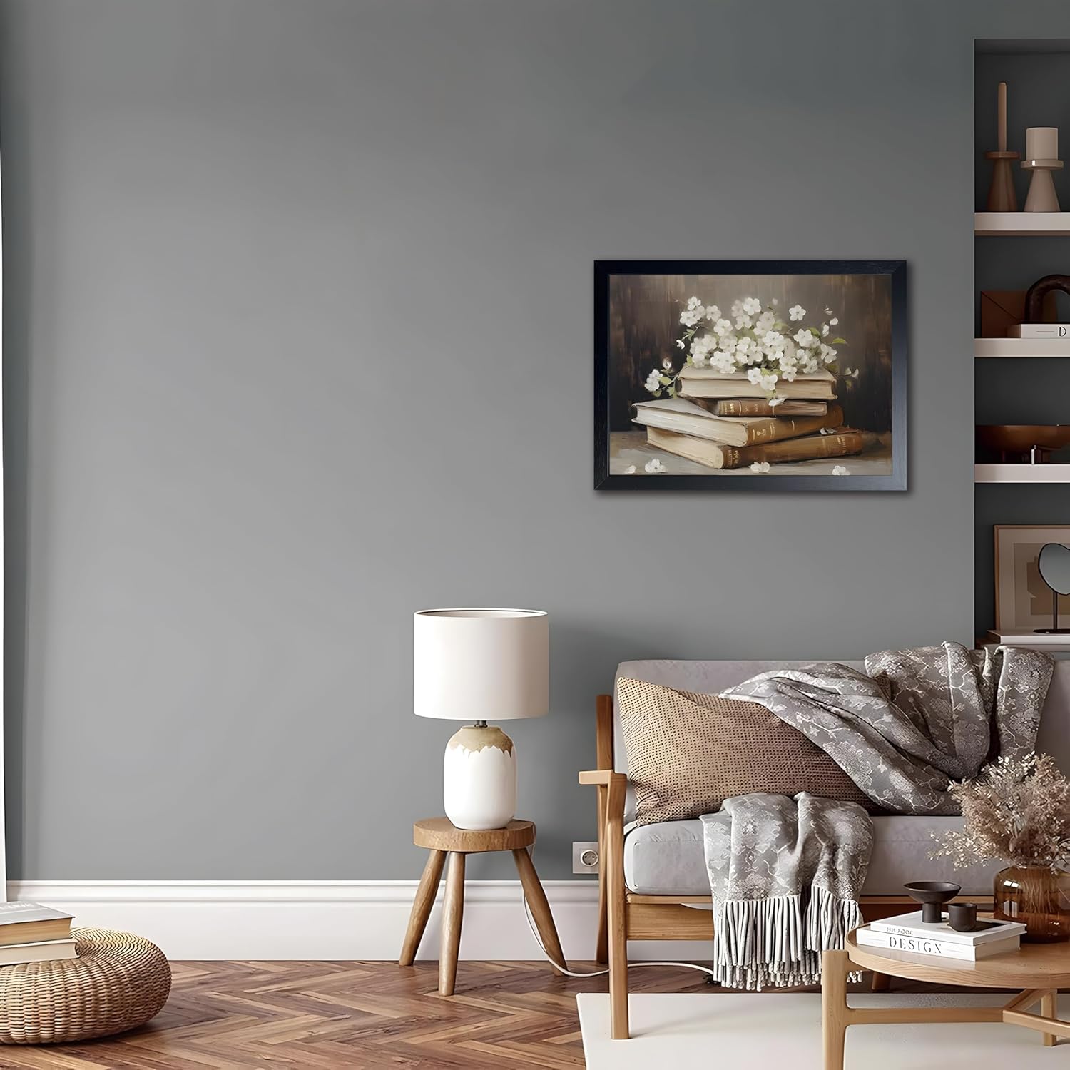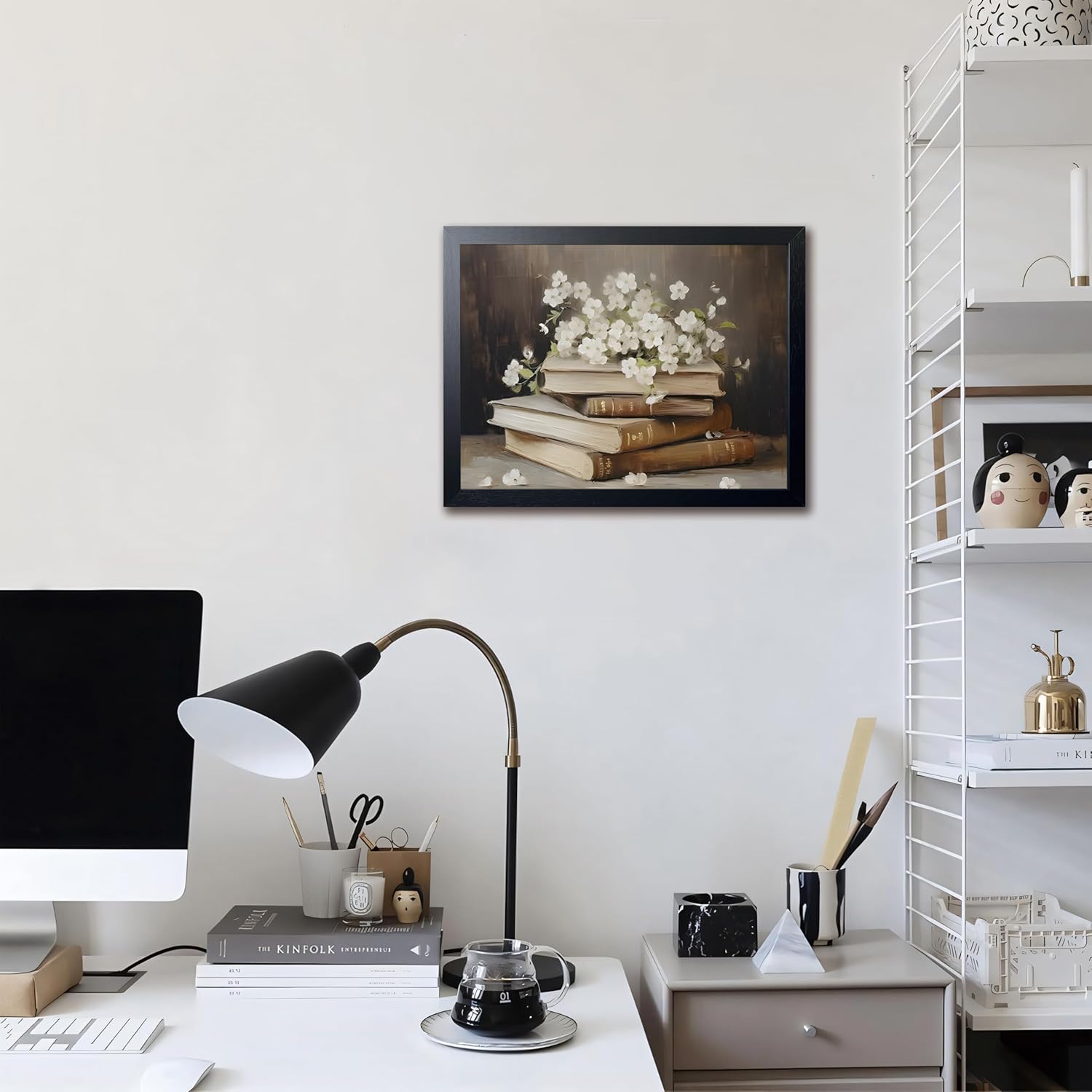 Wood Framed Canvas Poster Print Wall Art, Vintage Floral Book Wall Decor Oil Painting, Dark Academia Room Aesthetics Picture for Bathroom Classroom Dormitory room Decor 12x16 inch