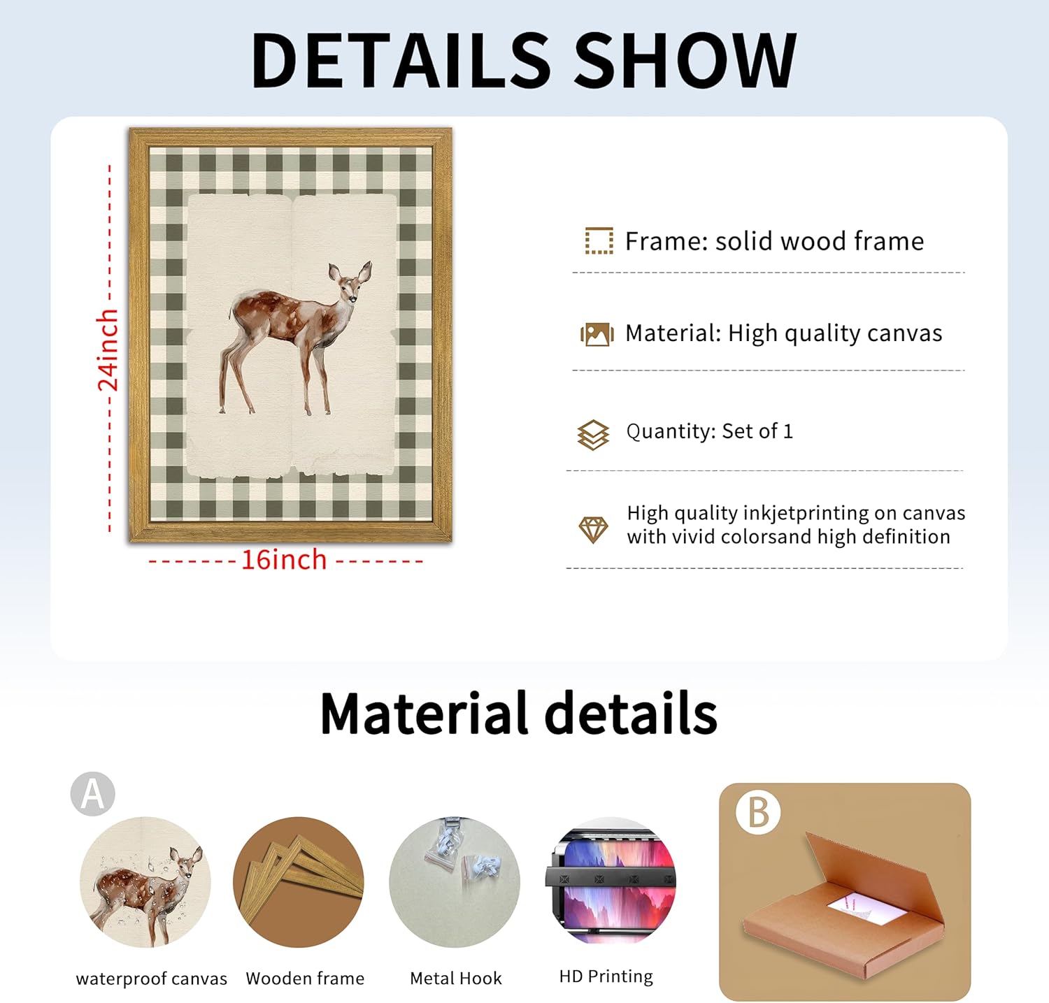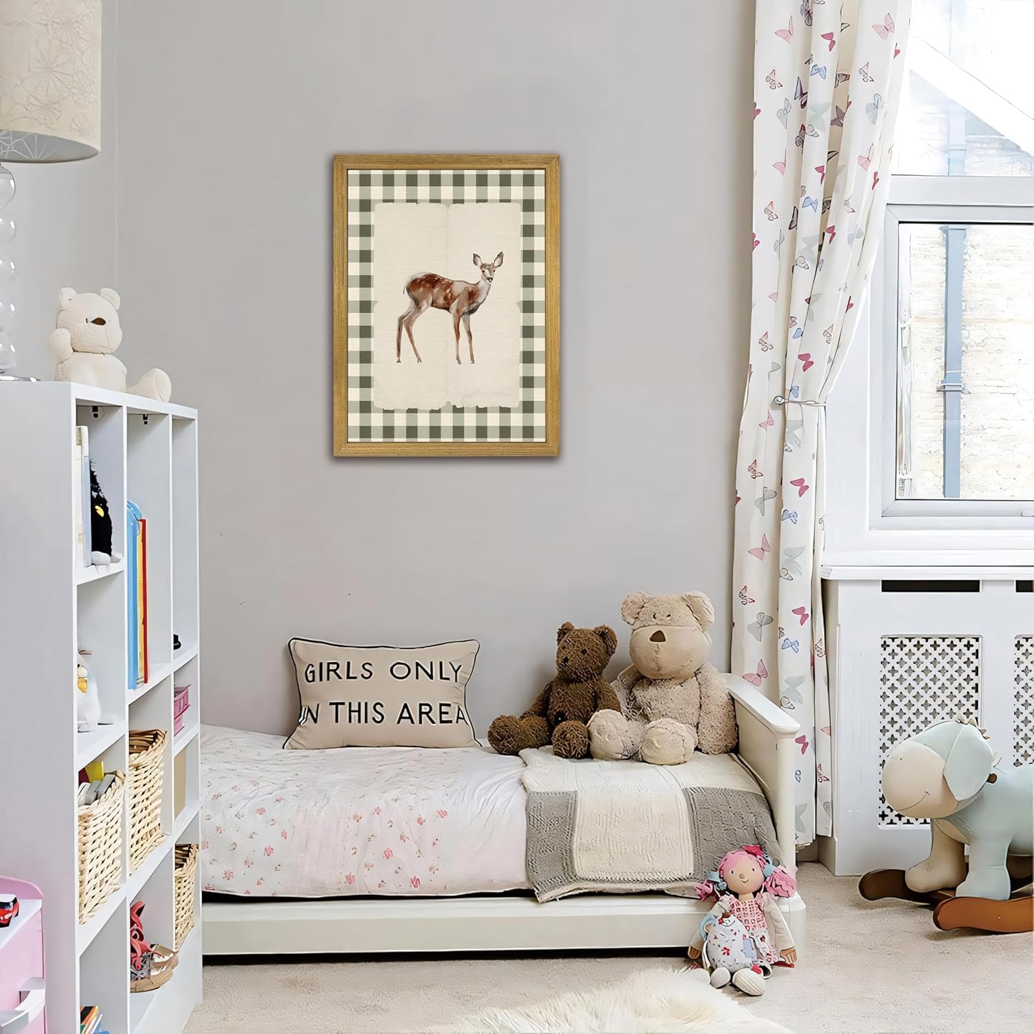 - Charming Woodland Baby Deer Design Wall Art – Features a beautifully illustrated fawn with soft watercolor textures, standing against a vintage-style parchment background and surrounded by a rustic green gingham border for a warm, farmhouse-inspired look.