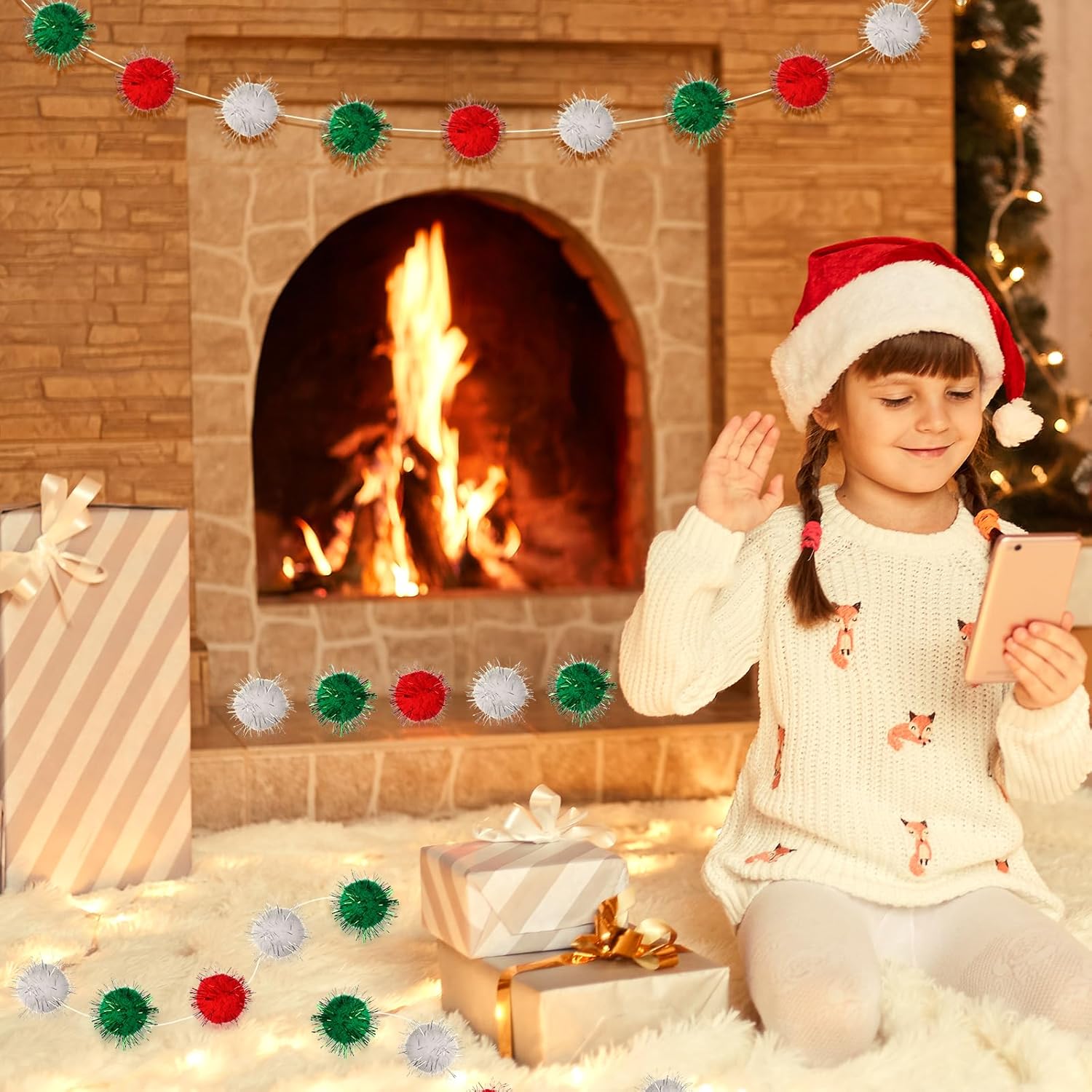 - Glitter Christmas Pom Pom Garland: Our Christmas ball garland is crafted from high-quality glittering balls in three classic Christmas colors, red, green, and white. The vibrant and sparkling colors will bring a unique touch to your Christmas