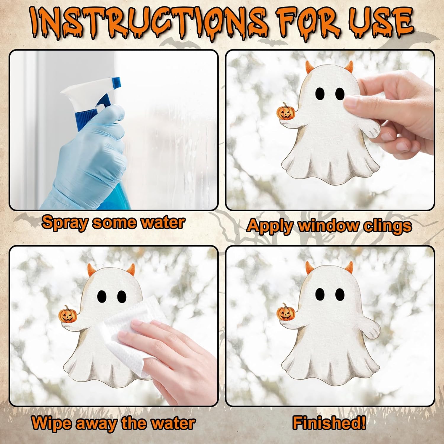 - Large Size Vintage Halloween Clings for Windows - Our retro Halloween cling stickers are a set of 6, featuring a variety of retro Halloween elements, including pumpkins, ghosts, bats, black cats, and more. Perfect for Halloween party decorations!