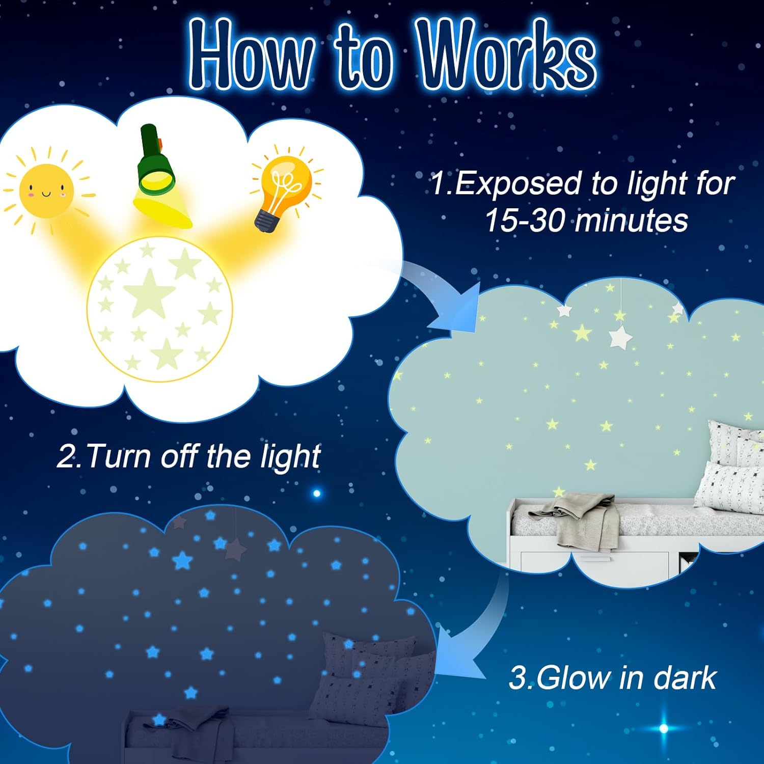- Long-lasting Glow: Put star glow in the dark ceiling stickers under the light or sunlight for a few minutes to make the stickers glow for a long time in the dark. By extending the light time, the brightness and duration of stars glow in the dark ceiling stickers at night will also increase.