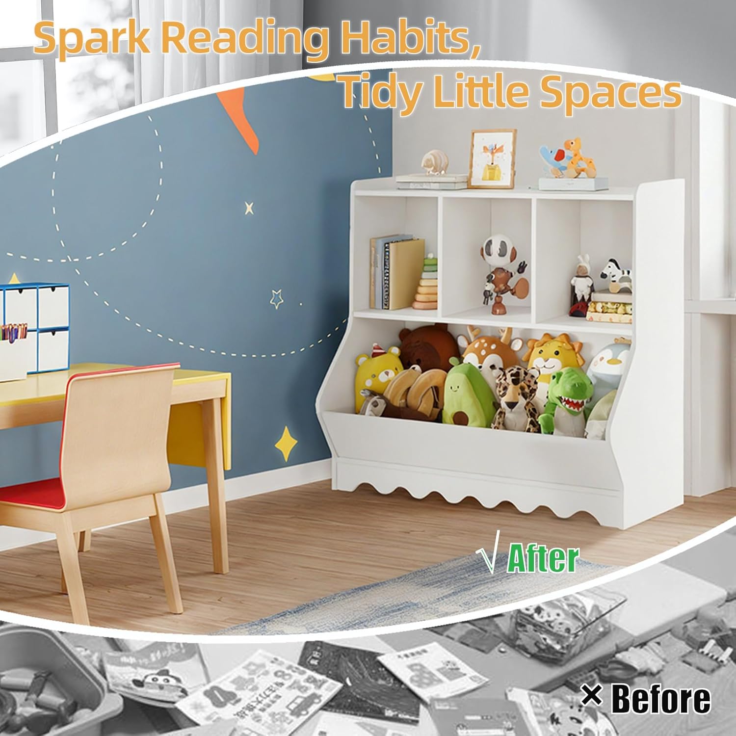 - ⭐️All-in-One Kids Bookshelf & Toy Storage: This multifunctional children’s bookcase combines three upper cubbies with a large bottom bin, offering plenty of space for books, toys, and art supplies. Say goodbye to messy toy bins and keep your child’s room neat, organized, and inviting.
