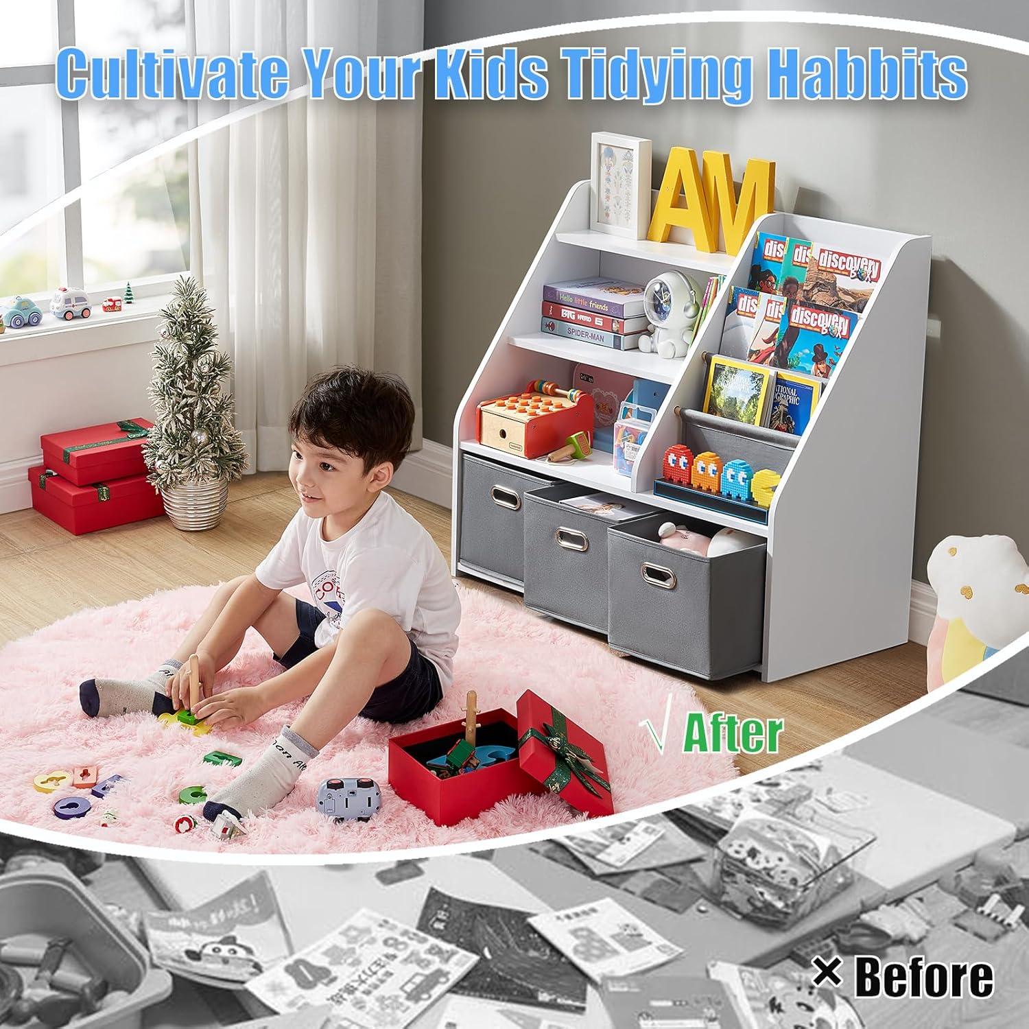 - ⭐️ [Quick Assembly & Versatile Placement] Comes with all tools and a clear manual for easy setup. Whether it’s in the kids' room, playroom, nursery, classroom, or reading corner, this bookshelf with toy bins helps keep your child’s space neat and tidy — and it’s easy to wipe clean.
